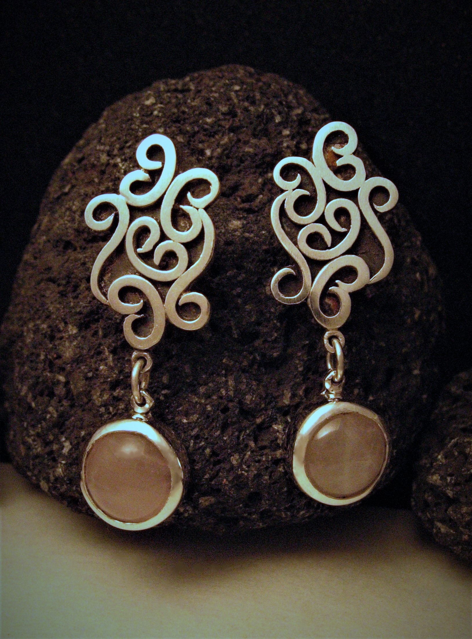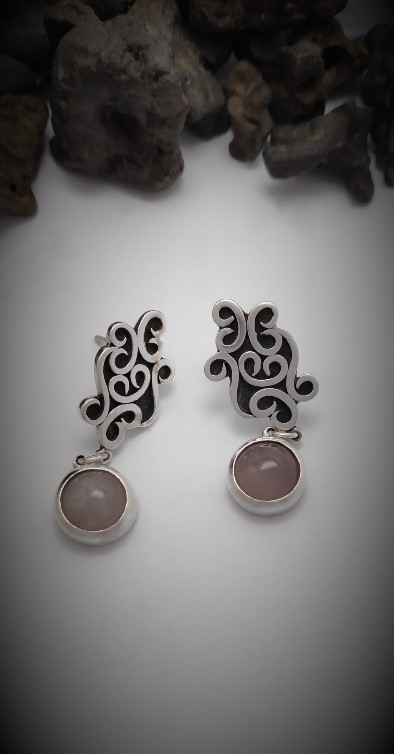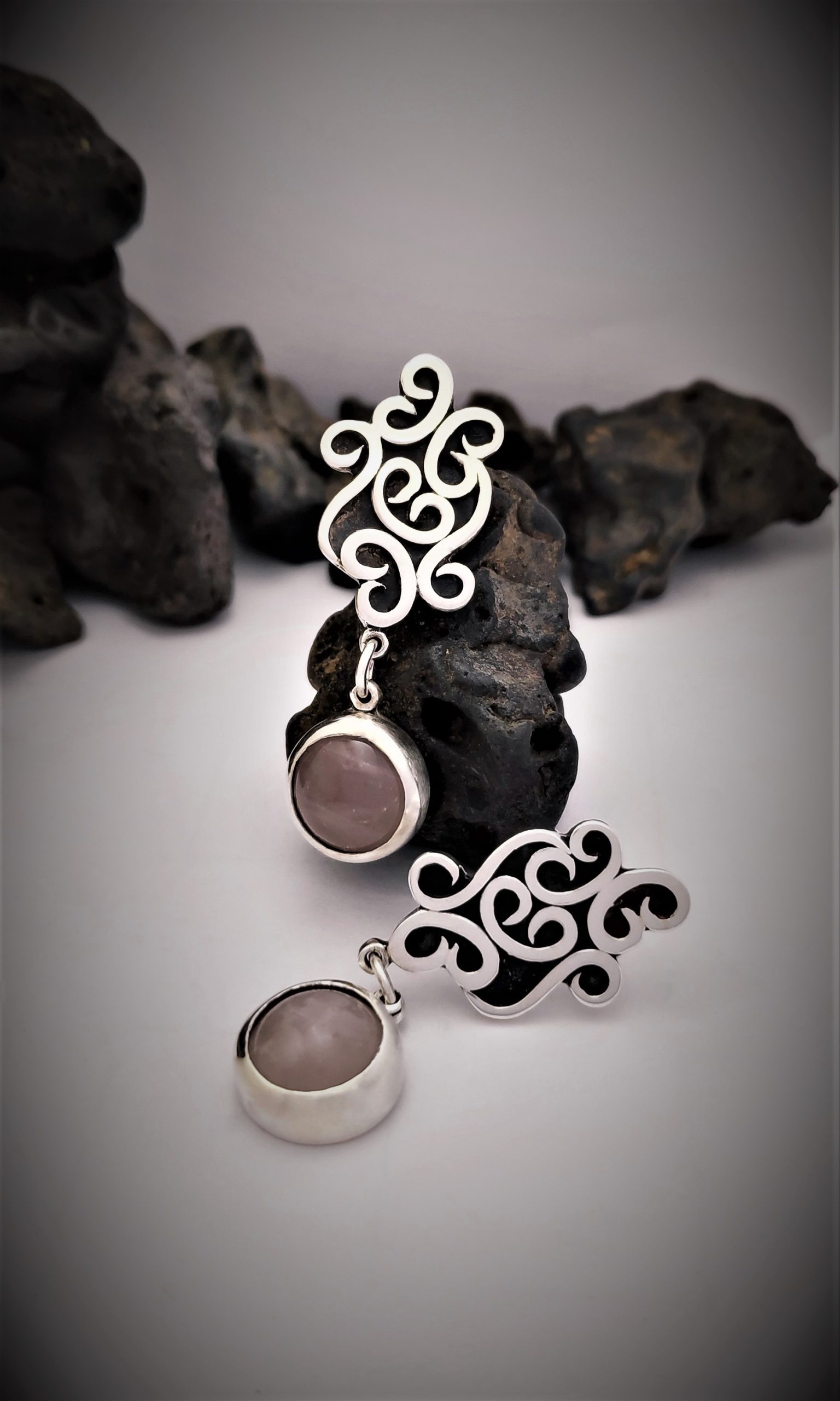 .Hechos a mano en plata (950) y piedra natural Cuarzo rosa, los pendientes tienen un movimiento aleatorio, siempre buscando al sol…
